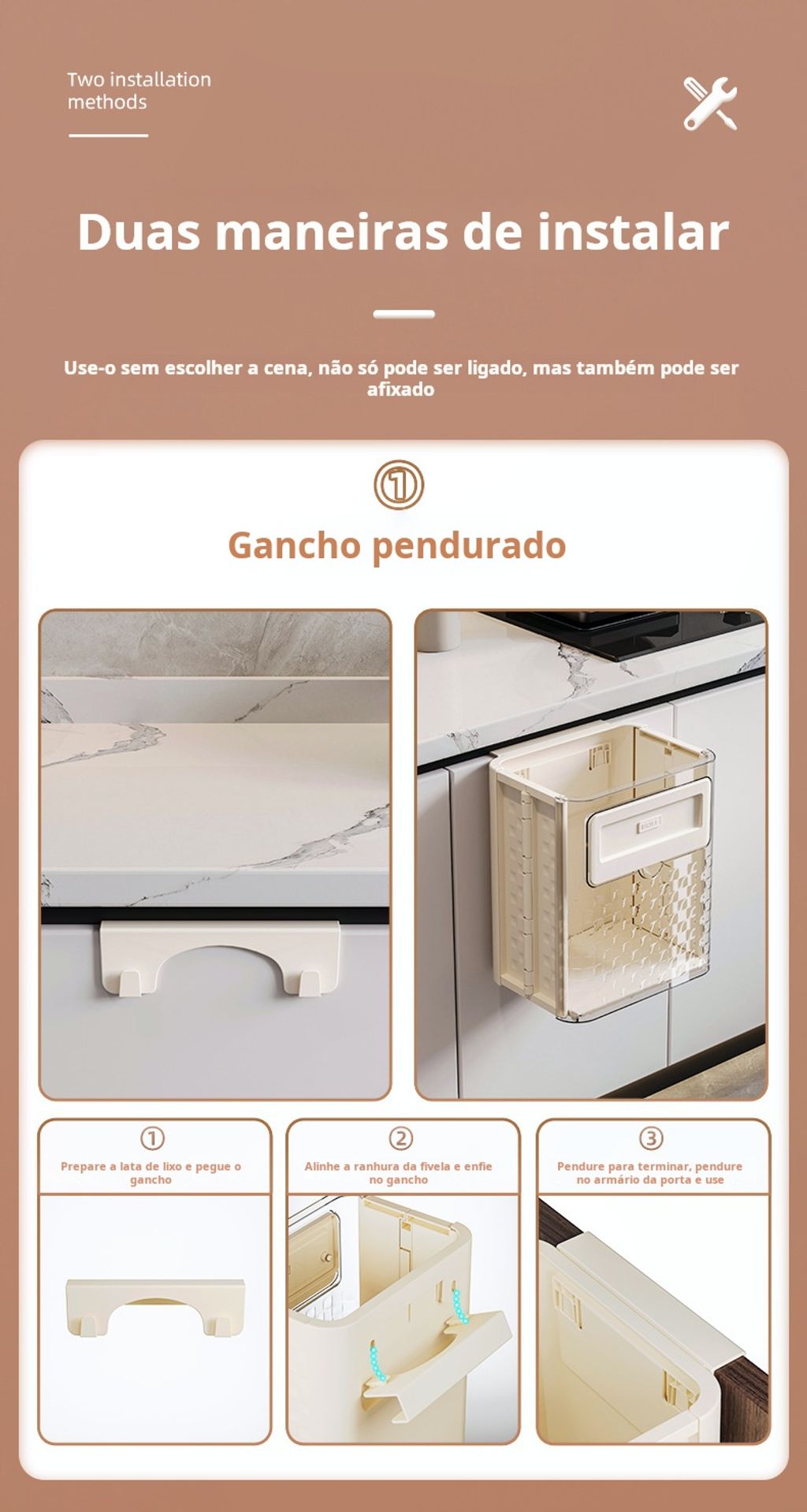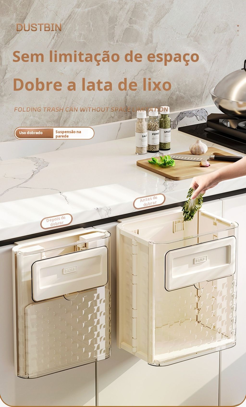 Lata de lixo pendurada na parede da cozinha