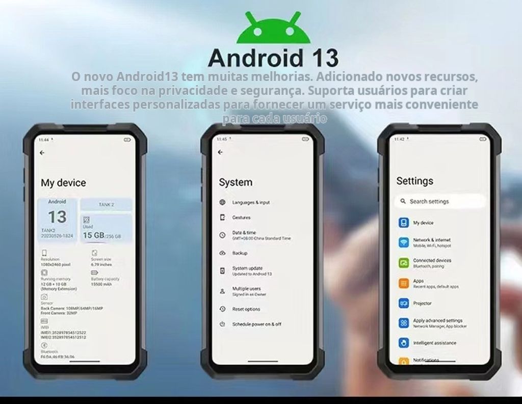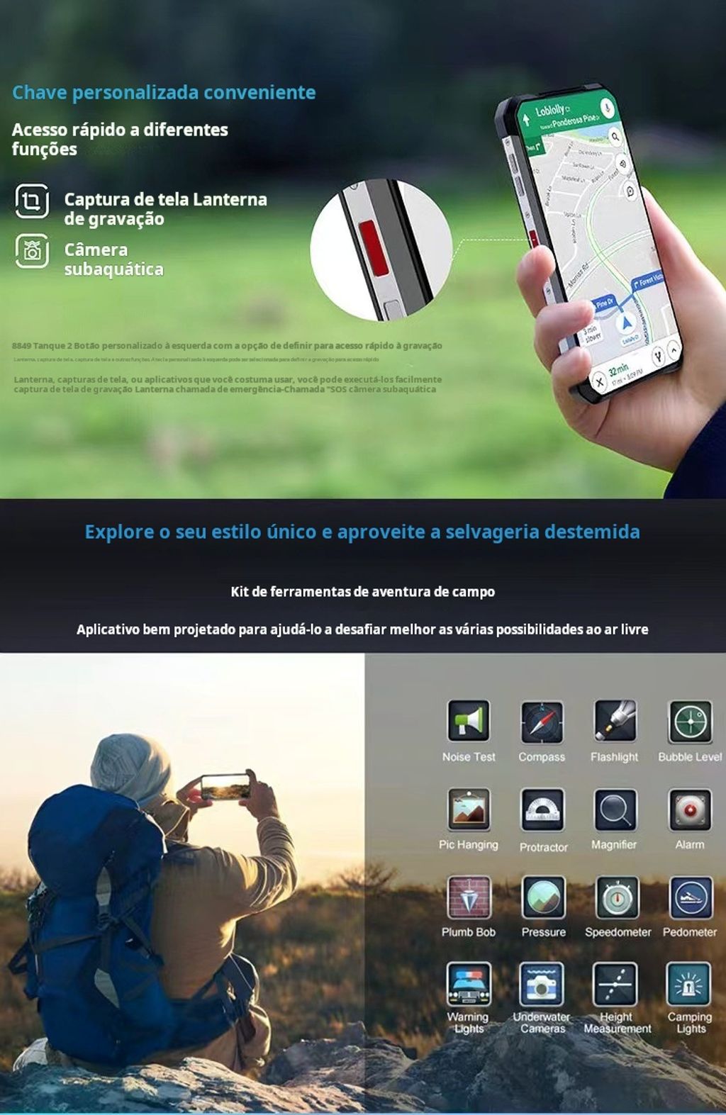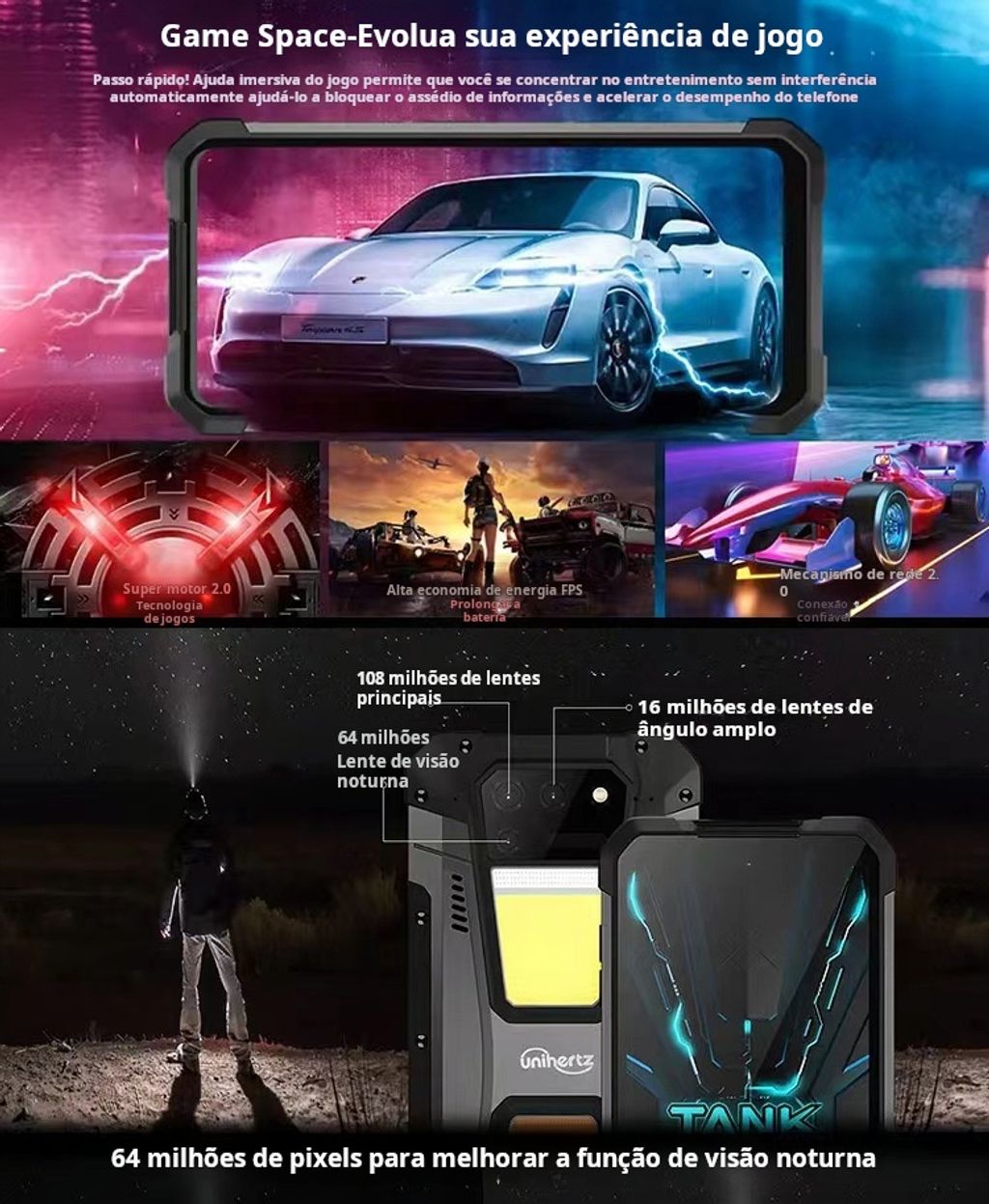 O Unihertz Tank 2 (8849) é um smartphone robusto projetado para resistir aos ambientes mais desafiadores. Equipado com uma impressionante bateria de 15.500 mAh, oferece autonomia prolongada para uso intenso. Sua tela de 6,79 polegadas proporciona uma experiência visual imersiva, enquanto o processador MediaTek Helio G99 garante desempenho eficiente para multitarefas. A câmera traseira de 108 MP captura imagens de alta qualidade, e o sistema operacional Android 13 oferece uma interface moderna e funcional. Além disso, o Tank 2 é resistente às intempéries, com certificação IP68, tornando-o ideal para aventuras ao ar livre e uso profissional em condições adversas.